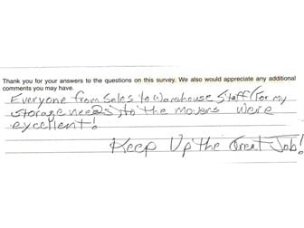 “Everyone from sales to warehouse staff for my storage needs to the movers were excellent!” Keep up the great job!