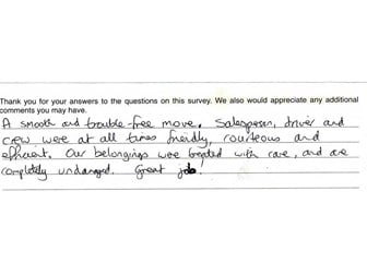 “A smooth and trouble-free move………..our belongings were treated with care and are completely undamaged. Great Job!”