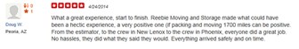 What a great experience, start to Finish. Reebie Moving and Storage made what could have been a hectic experience, a very positive one (if packing and moving 1700 miles can be positive.