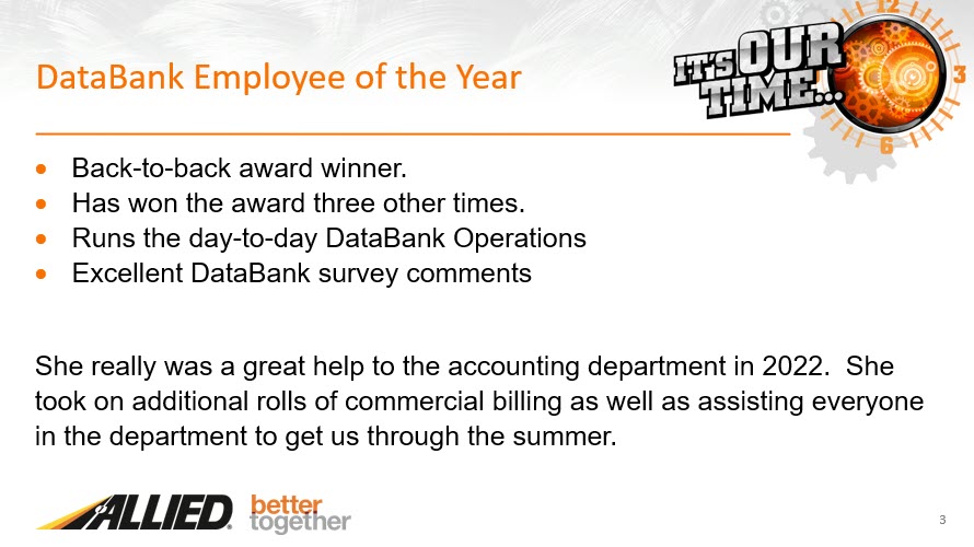 I cannot emphasize enough what a tremendous job the accounting department did in 2022. With Laurie Gomez and Mike Callahan leaving the department in June, it put an unbelievable stress on the department. But, they worked together as a team and got the work done.