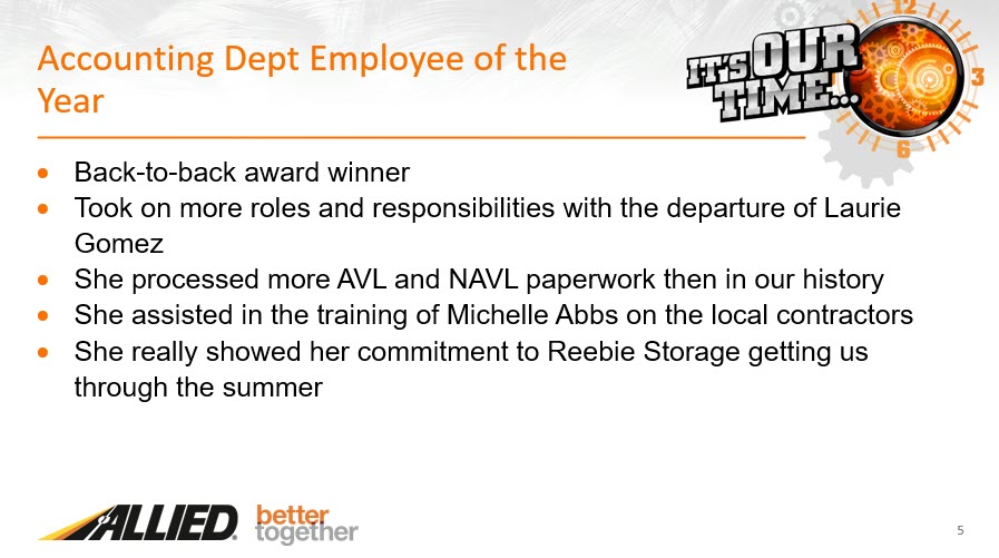We hired Michelle Abbs and Ashley Anderson to help fill in some of the work load and they both did an outstanding job. They learned quickly and performed the work accurately and on time. Other team members stepped up to increase their roles and responsibilities: Kim Cushing, Connie Sierzega, Alicia Garza, Yamilet Rodriquez, Gonzalo Carrillo and Dulce Gonzalez all did on outstanding job getting us through the summer with the most revenue ever recorded in Reebie history. I am very proud of each and every one of them and so glad to have them on my team.